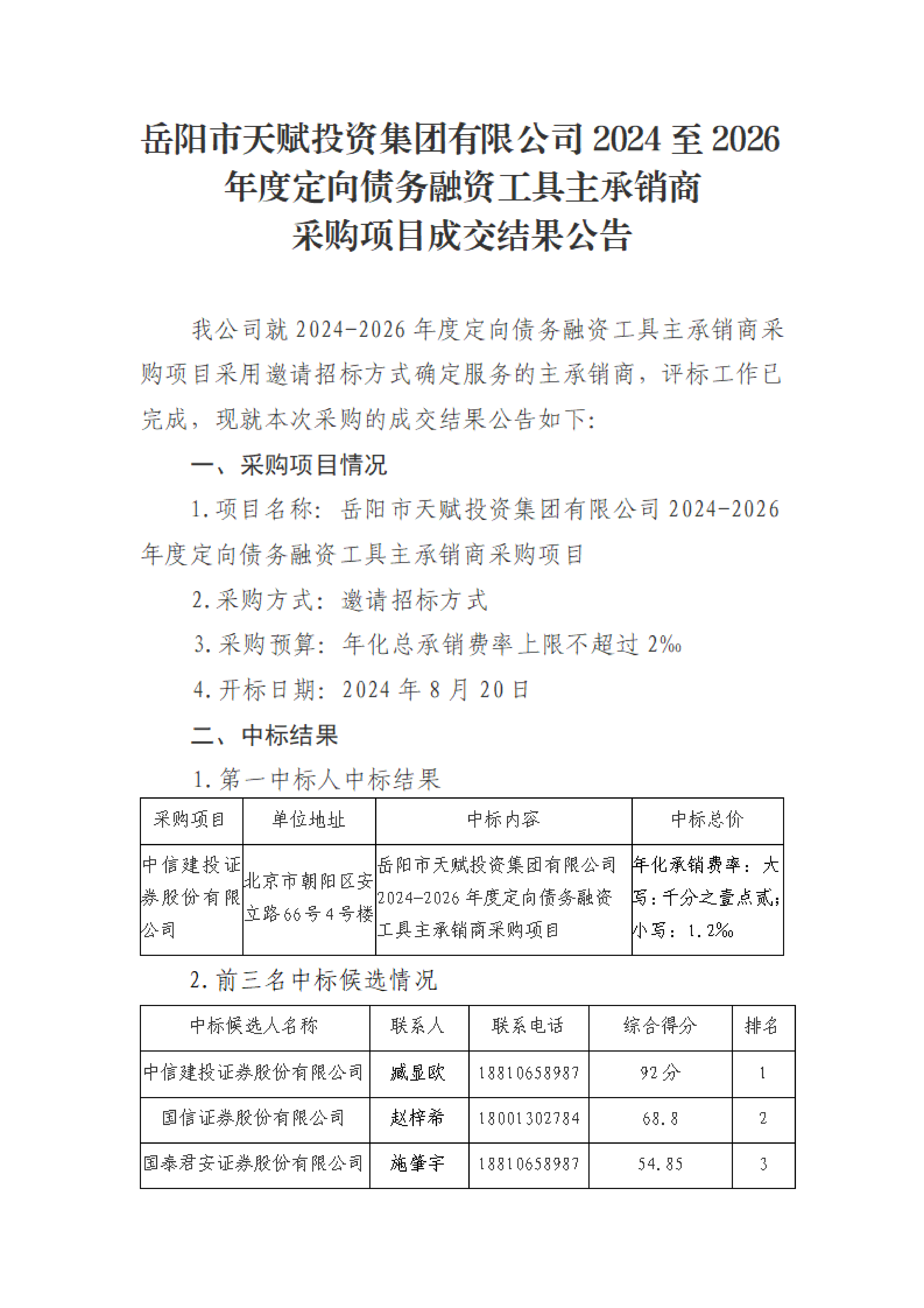岳陽市天賦投資集團(tuán)有限公司2024至2026年度定向債務(wù)融資工具主承銷商采購項(xiàng)目成交結(jié)果公告