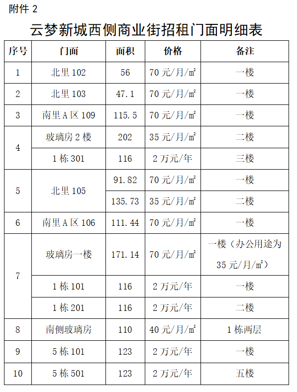 標(biāo)的3:云夢新城西側(cè)商業(yè)街及配套房位于南湖新區(qū)云夢路,千畝湖對面,共9間商鋪和5套配套房可供出租(詳見附件表格),總面積1634.73平方米。其中一樓6間,月租金70元/平方米/月;二樓2間,月租金35元/平方米/月;配套房年租金2萬/年;玻璃房1間,月租金40元/平方米/月,首年度按8.5折進(jìn)行優(yōu)惠,自第3個租賃年度起租金逐年遞增5%。